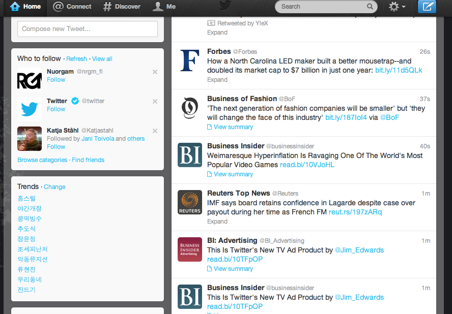 Haven’t found any korean friends with a twitter account yet. Even though Finland is also considered a developing country when it comes to twitter I’d say it’s ahead of Korea a lot. In Finland it’s mostly popular among journalists and politicians, but many young people are slowly getting into it. I’ve had a twitter account for a few years now, but didn’t actively use it until recently. Although I find it great being able to share and discover thoughts openly with strangers.