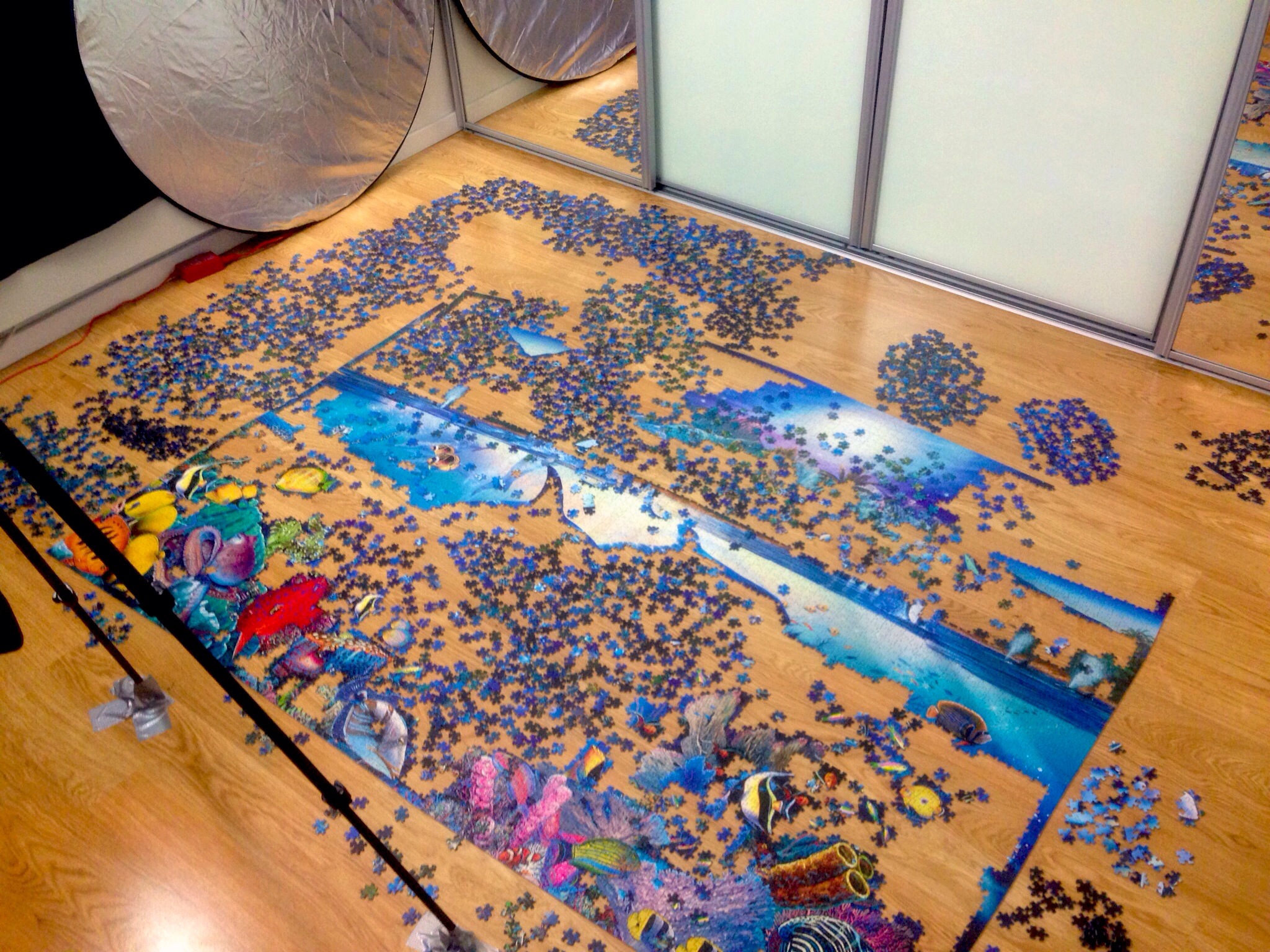 I tried it out by making a three second clip when I was flipping the pieces and was surprised how easy it was. With the actual puzzle it was difficult to estimate how long it would take to finish, sometimes it takes four hours, sometimes more than ten. I shot one frame per minute in order to keep the film fairly short. It turned out pretty well for my first one but I noticed things I will have to take into account in the future so I also learned a lot from my little experiment.