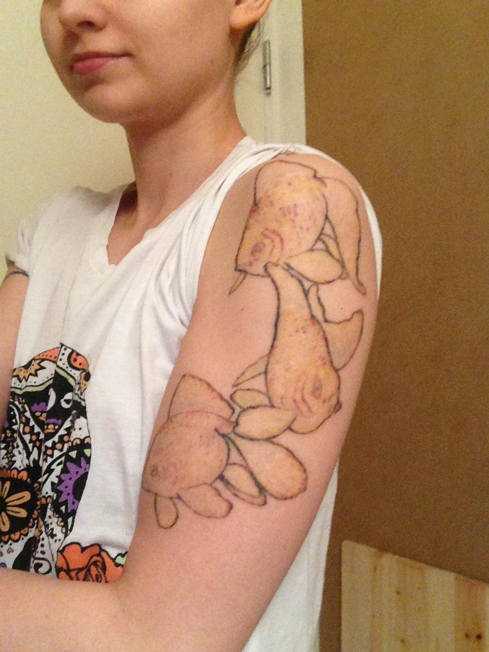 Tasan kaksi vuotta takaperin otin käsivarteen suht ison kultakalatatskan. Siitä ei tullut ihan sitä, mitä olin halunnut, mutta yritin parin kuukauden ajan uskotella itselleni, etä pidän siitä. Sitten eräänä päivänä sain tarpeekseni ja päätin poistattaa sen. En ole aktiivisesti dokumentoinut prosessia, koska en ole tästä erityisen ylpeä. Halusin nyt kuitenkin jakaa kokemukseni, koska tää asia koskettaa nykyisin valitettavan monia ja olen itsekin etsinyt aktiivisesti muiden jakamia kokemuksia tatuoinninpoistosta. Tatuointi oli ihan siististi tehty, mutta isompi ja ei ihan sen tyylinen, kuin mitä olin halunnut. Mulla on kyljessä toinen tatuointi, jota on myös laseroitu, mutta siitä lisää mahdollisesti myöhemmin. Yhteensä tatskoja mulla on noin kymmenen. Tähän asti sekä käsi, että kylki on laseroitu aina samalla kertaa, tänään kävin laseroimassa vain käden, koska haluan sen nyt ensin pois. Keskityn kylkeen sitten myöhemmin.