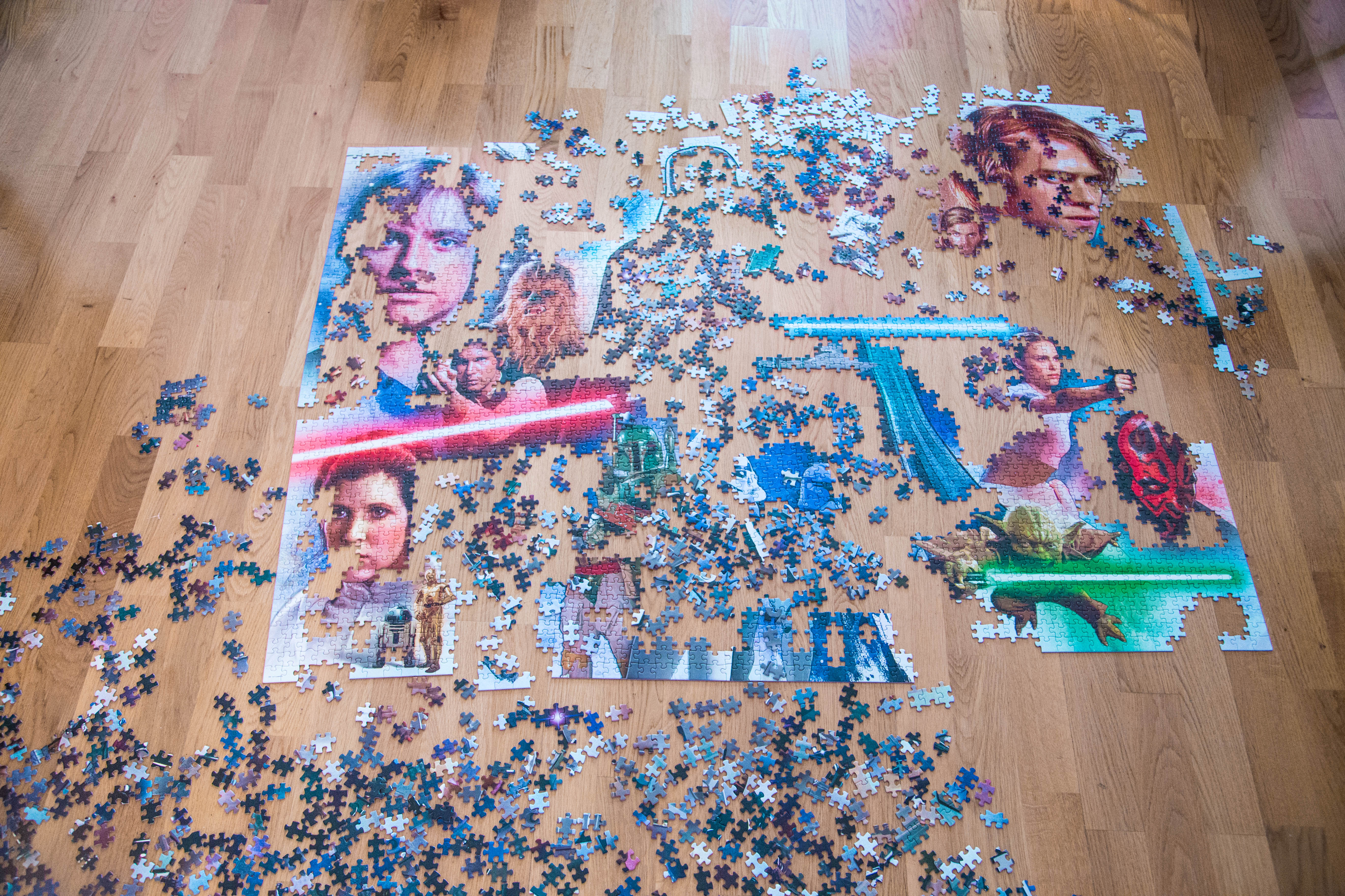 I buy my puzzles based on the number of pieces, as well the design. 1000 pieces is usually not enough. I prefer puzzles that have between 1500 and 4000 pieces, since it won’t be over in four hours, but it won’t take several months either. Unfortunately 1000 pieces is the most common number.I bought a 3000-pieces Star Wars puzzle from the store here, the dark parts were a bit too hard, or at least in the light we have here. But otherwise it was perfect! Puzzles are too much of fun to be shared with Finns only, so I wrote this one in English.